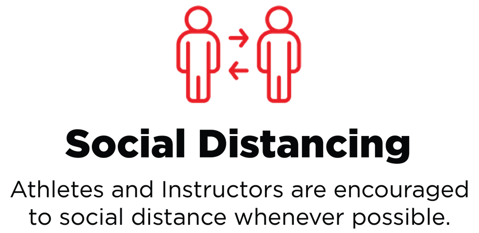Specifically for our weekly classes, athletes and instructors must stay socially-distanced and wear secure face coverings. We recommend cloth masks that fit snugly to the face in order to reduce adjusting during physical activity. Every class will be equipped with an Instructor Bin that will contain supplemental sanitizer, wipes, disposable masks (only to be used when a secure cloth mask is not available), and thermometers to assist in on-site screening. Each class is required to pause every 30-minutes for a Sanitation Break. This means every participant must wash or sanitize their hands before returning to classwork.